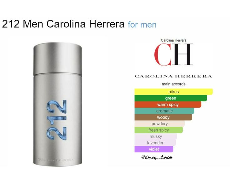 212 Men by Carolina Herrera is a Woody Floral Musk fragrance for men. 212 Men was launched in 1999. 212 Men was created by Alberto Morillas, Rosendo Mateu and Ann Gottlieb. Top notes are Green Notes, Grapefruit, Spices, Bergamot, Lavender and Petitgrain; middle notes are Ginger, Violet, Gardenia and Sage; base notes are Musk, Sandalwood, Incense, Vetiver, Guaiac Wood and Labdanum