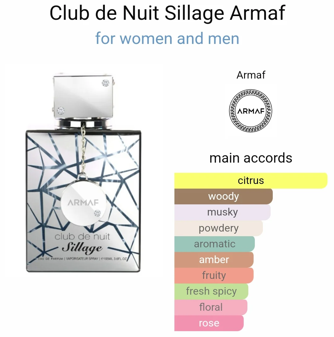 & Free ShippingClub de Nuit Sillage by Armaf is a Floral Woody Musk fragrance for women and men. Club de Nuit Sillage was launched in 2020. Top notes are Bergamot, Lemon, Black Currant, Lime, Violet Leaf and Ginger; middle notes are Rose, Iris and Jasmine; base notes are Ambroxan, Musk, Sandalwood and Cedar.