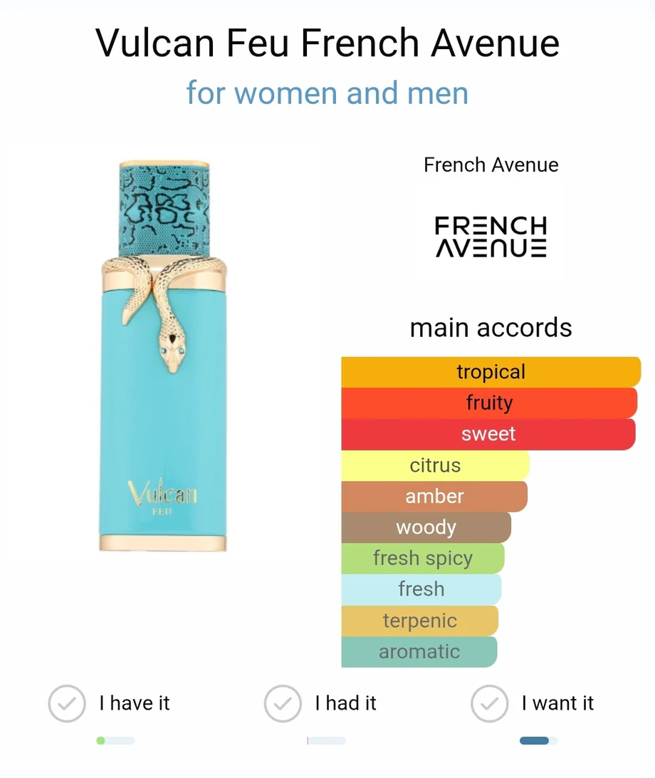& Free ShippingVulcan Feu by French Avenue is a Floral fragrance for women and men. This is a new fragrance. Vulcan Feu was launched in 2025. Top notes are Mango, Lemon, Ginger and Rhubarb; middle notes are Jasmine, Pink Pepper, Violet and Praline; base notes are Tonka Bean, Cedarwood, Ambergris and Moss.